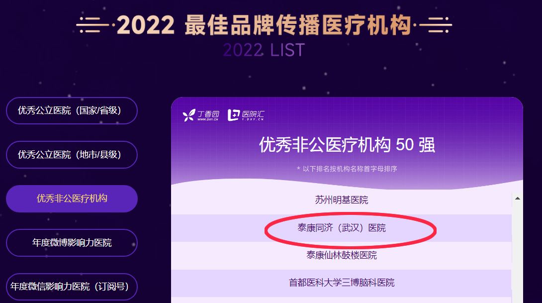 7月21日,国内知名行业媒体丁香园发布“2022年度最佳品牌传播医疗机构榜单”,泰康同济(武汉)医院再次荣登“2022年度最佳品牌传播医疗机构优秀非公医疗机构50强”榜单。这也是泰康同济(武汉)医院自2020年起,连续三年获此殊荣。
