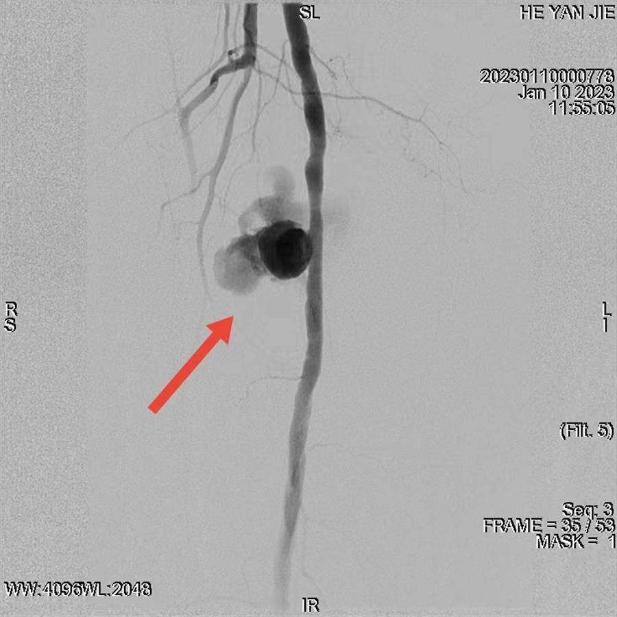 假性动脉瘤瘤体最长径达到10cm,为少见的巨大假性动脉瘤