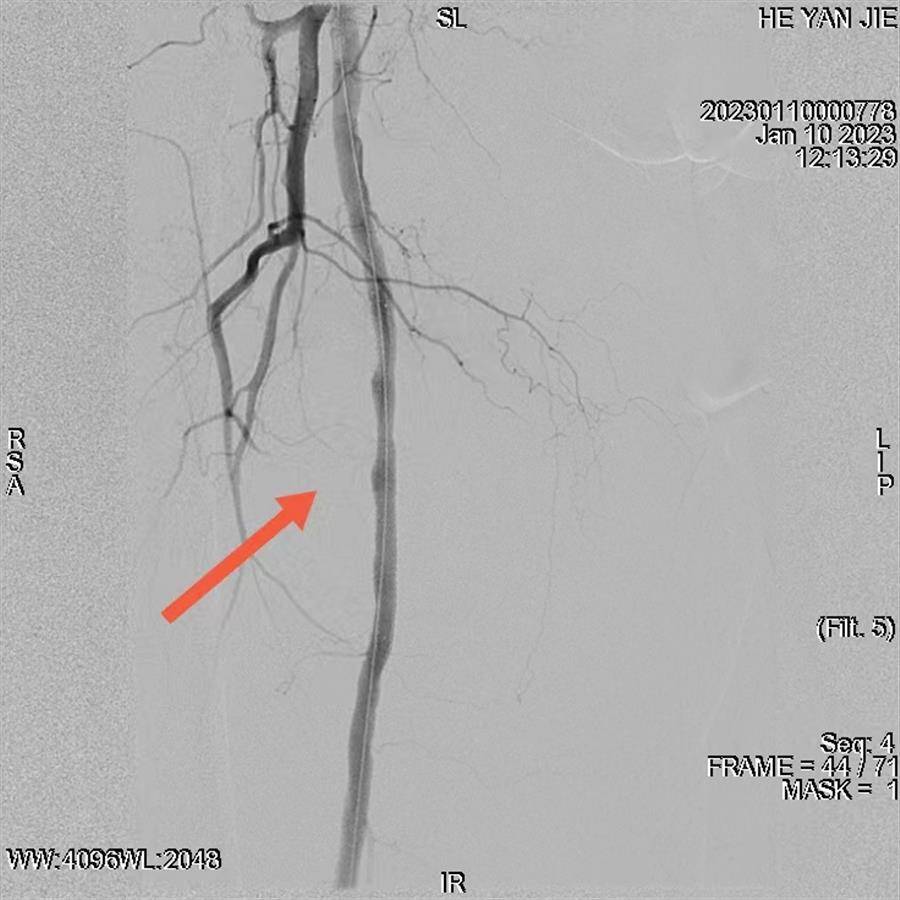 股浅动脉中段植入支架后,原假性动脉瘤瘤腔被完全隔绝,无显影
