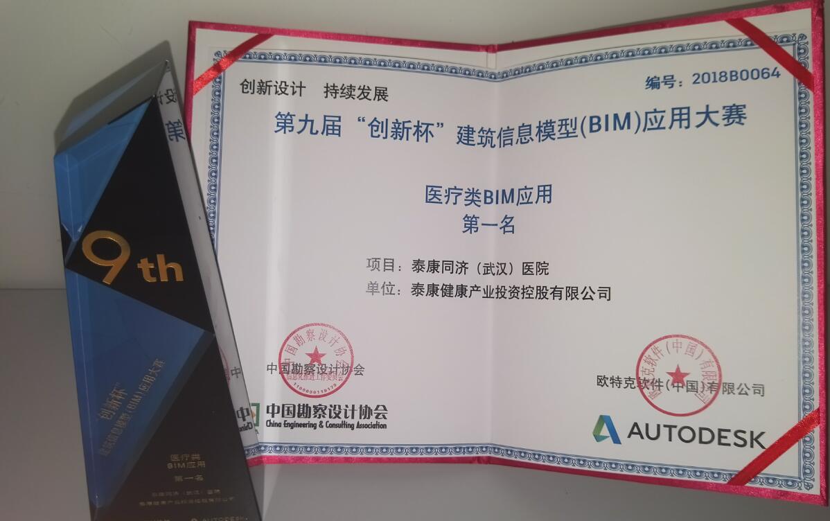 2018年9月20日,在中国勘察设计协会和欧特克软件(中国)有限公司联合举办的“创新杯”建筑信息模型(BIM)应用大赛上,泰康同济(武汉)医院项目获得医疗类BIM应用第一名。