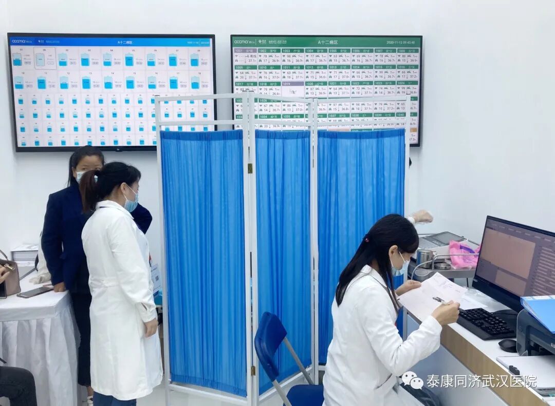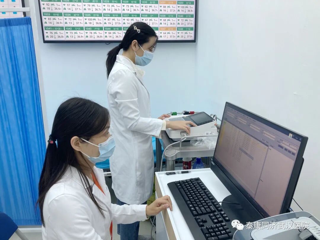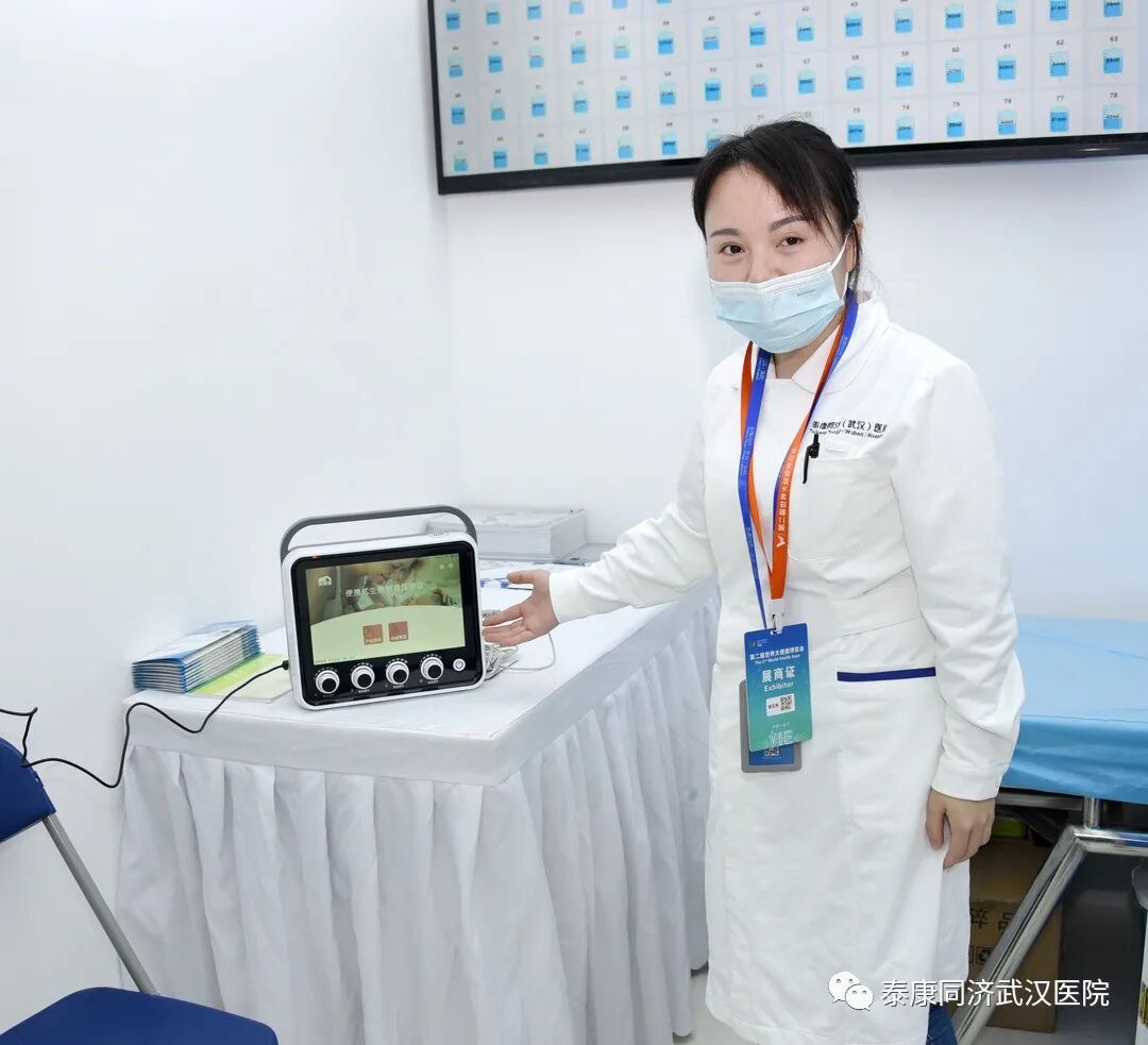 在智慧医疗体验区,可以体验远程心电监护,做心电图检测出结果,心血管专家在泰康同济(武汉)医院为您提供远程解读与指导。