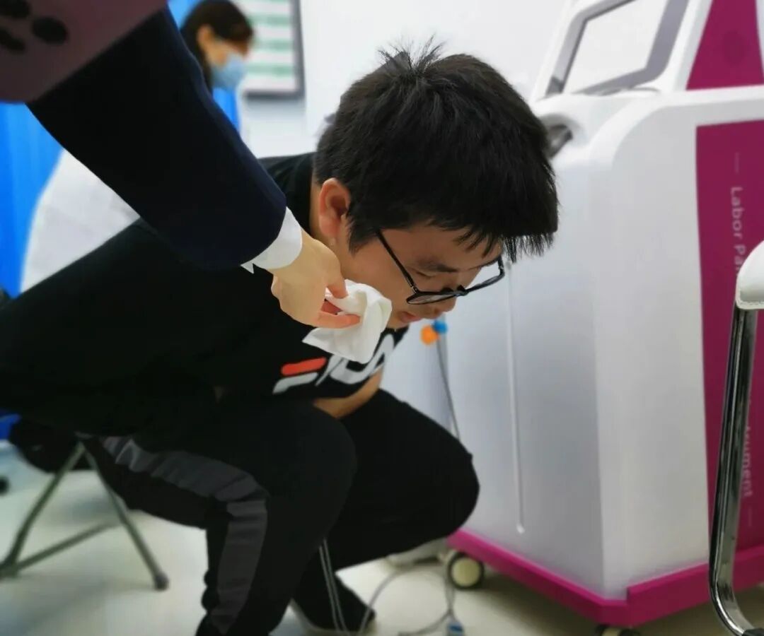 懂得她有多痛,才会知道爱她该有多深。分娩镇痛体验仪用于模拟分娩阵痛,让男士们体验最高级别为十级的疼痛,感受妻子生孩子的不易。一位男性游客体验到八级,就已经痛得大汗淋漓站不起来。
