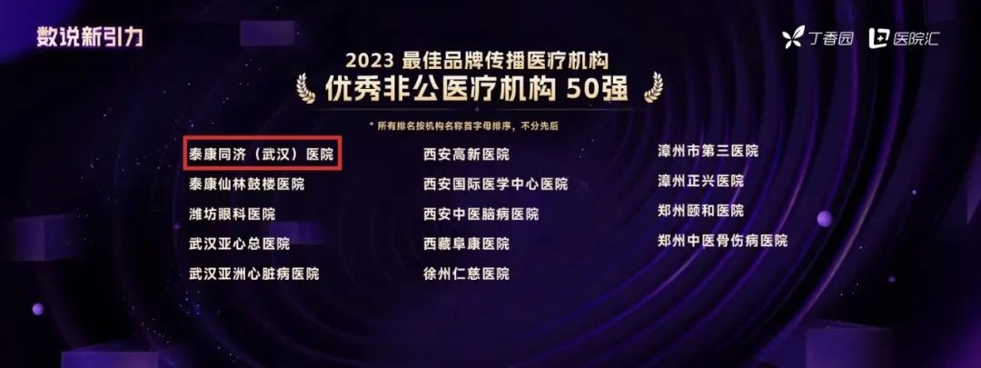 6月28日,在丁香园与四川大学华西医院共同举办的第六届中国医院发展大会(CHDC)上,丁香园 · 医院汇发布了「2023 最佳品牌传播医疗机构」榜单,泰康同济(武汉)医院再次荣登“2023年度最佳品牌传播医疗机构优秀非公医疗机构TOP50”榜单,这也是泰康同济第4年获评「最佳品牌传播医疗机构优秀非公医疗机构 50 强」。