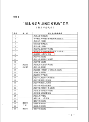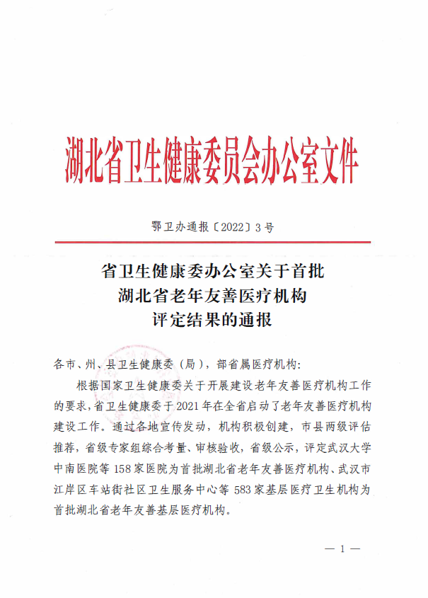 根据国家卫生健康委关于开展建设老年友善医疗机构工作的要求,湖北省卫生健康委于2021年在全省启动了老年友善医疗机构建设工作。 通过各地宣传发动, 机构积极创建, 市县两级评估推荐, 省级专家组综合考量、审核验收,省级公示,评定武汉大学中南医院等158家医院为首批湖北省老年友善医疗机构、武汉市江岸区车站街社区卫生服务中心等583家基层医疗卫生机构为首批湖北省老年友善基层医疗机构。湖北省卫生健康委要求获评老年友善医疗机构的单位,要发挥示范带动作用,再接再厉,开拓创新,进一步优化为老服务工作,切实提高社会和公众认可程度。各地、各医疗机构要进一步提高思想认识,加强组织领导,创新服务模式,完善工作措施,继续做好老年友善医疗机构建设工作,确保到2022年末全省80%以上为老年人提供医疗服务的医疗机构成为老年友善医疗机构。要坚持老年友善理念,认真总结典型经验,提升建设成效,共同推动老年友好型社会建设 要重视并加强老年医学科建设,不断提升老年医疗服务水平,更好地满足老年人日益增长的健康服务需求,促进全省老年友善医疗机构高质量发展,为健康湖北建设作出更大贡献。
